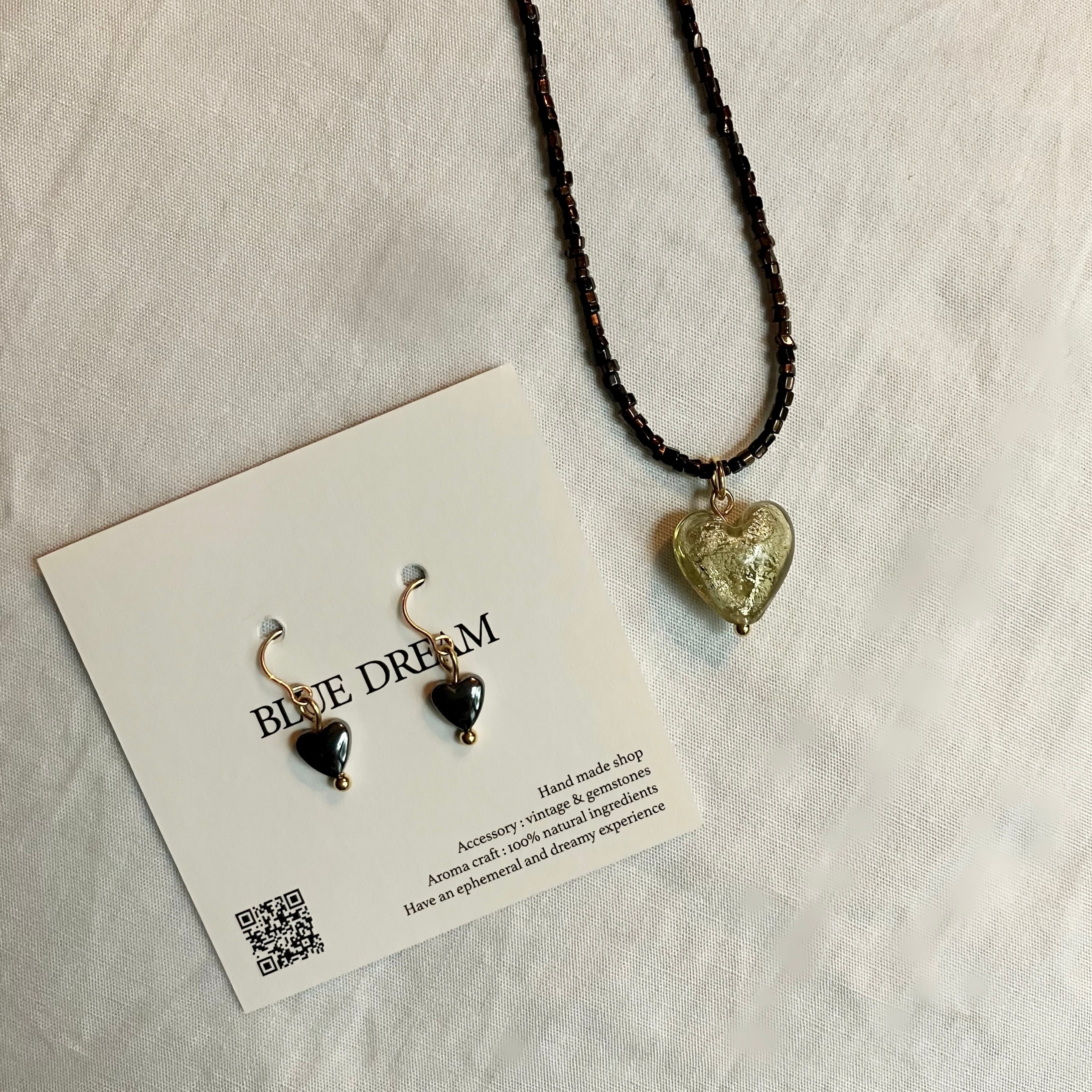 夜の静けさの中、月の光に照らされながら生まれたような、深く煌めくハートの石のピアス。