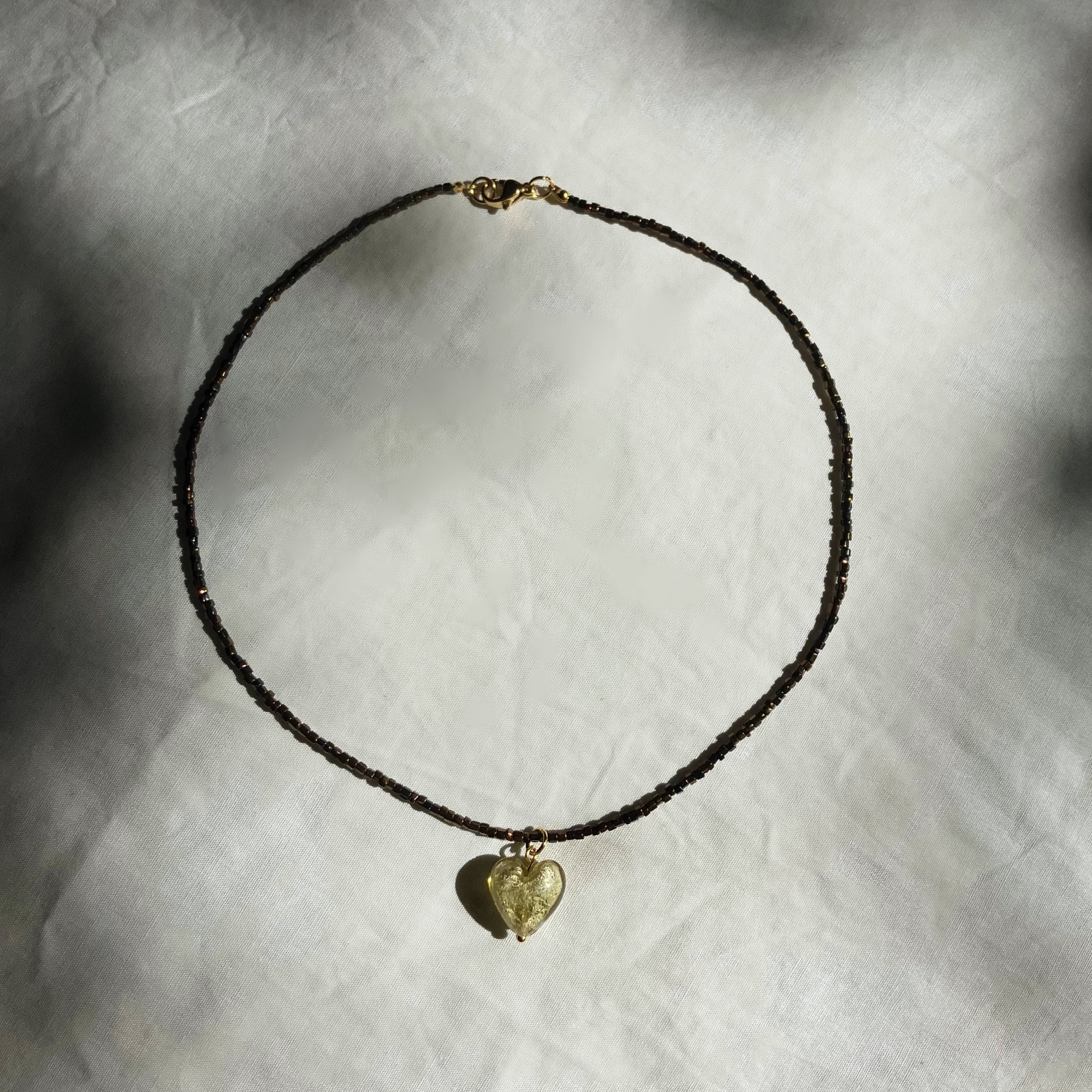 深みのあるダークブラウンのビーズラインは、その輝きをやさしく包み込み、静かなぬくもりの中で光を引き立ててくれます。